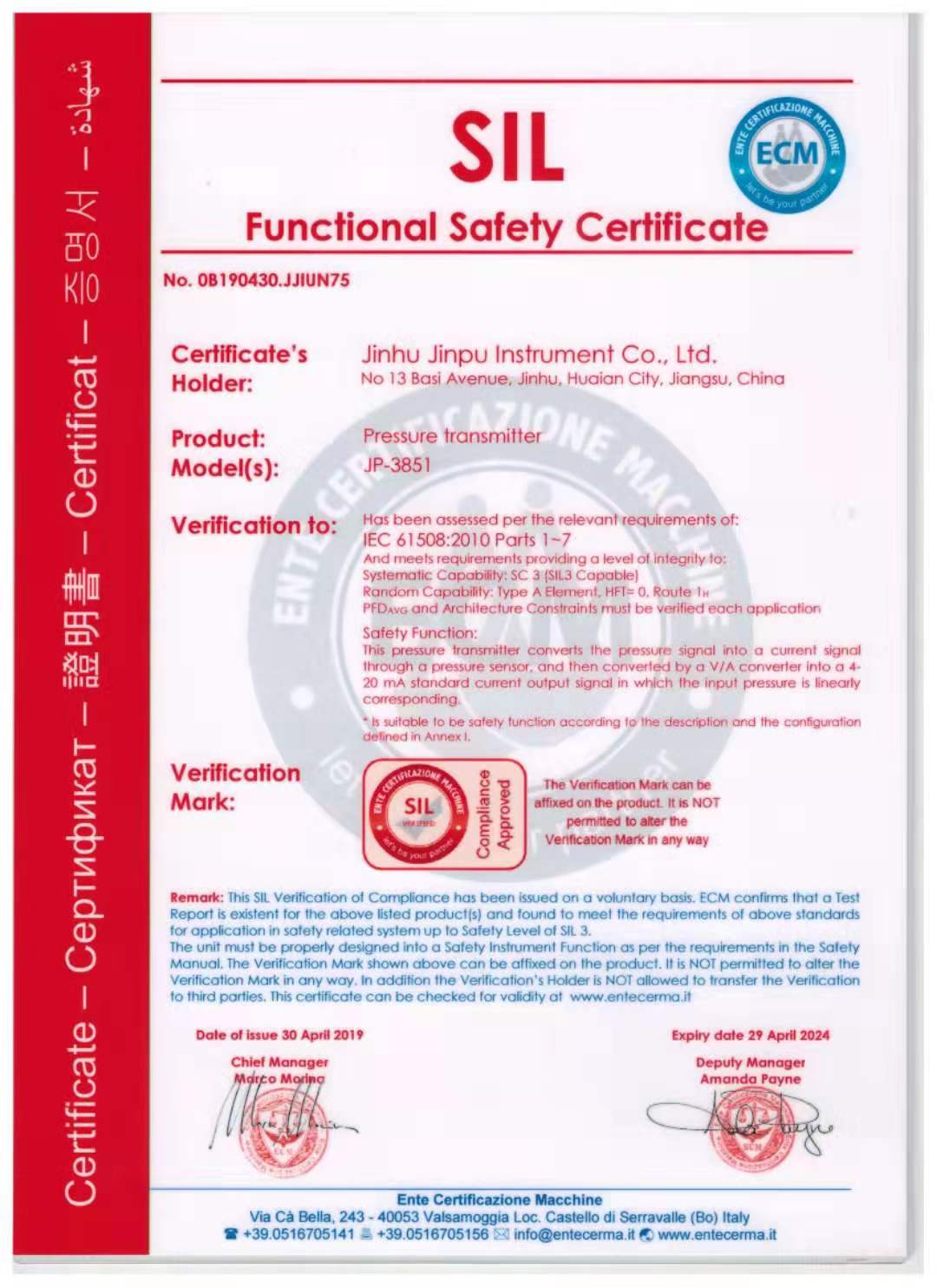 以下圖片為金湖金普儀表獲得的SIL2認(rèn)證,該證書(shū)證明了變送器質(zhì)量?jī)?yōu)秀,獲得廣大用戶認(rèn)可。