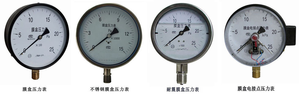 不銹鋼膜盒壓力表由測量系統(包括接頭,波紋膜盒等),傳動機構(包括拔桿機構,齒輪傳動機構),指示部件(包括指針與度盤)和外殼(包括表殼、襯圈和表玻璃)所組成。