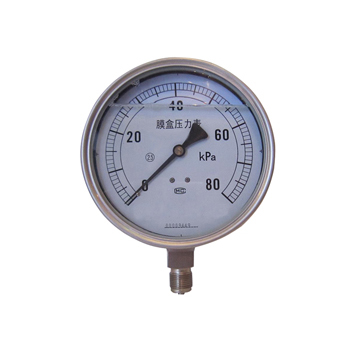 膜盒耐震壓力表由測(cè)量系統(tǒng)(包括接頭膜盒等)、傳動(dòng)機(jī)構(gòu)、指示裝置和外殼組成。當(dāng)被測(cè)介質(zhì)的壓力作用于膜盒時(shí),其自由端產(chǎn)生相應(yīng)彈性變形一位移,經(jīng)撥桿帶動(dòng)傳動(dòng)機(jī)構(gòu)放大,由指示裝置將被測(cè)壓力在儀表盤(pán)上指示出來(lái),且表內(nèi)充油,達(dá)到耐震的效果。